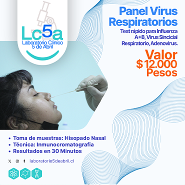 Test rápido para Influenza A+B, Virus Sincicial Respiratorio, Adenovirus. • Toma de muestras: Hisopado Nasal • Técnica: Inmunocromatografia • Resultados en 30 Minutos • Valor $12.000 Puede ver los resultados online, ingresando a nuestro sitio web; http://laboratorio5deabril.cl/ Casa Matriz: Centro Medico Cordillera, Av. Argentina 648, Chillán Toma de Muestra: Centro Medico 5 de Abril, Calle 5 de abril 570, Chillán