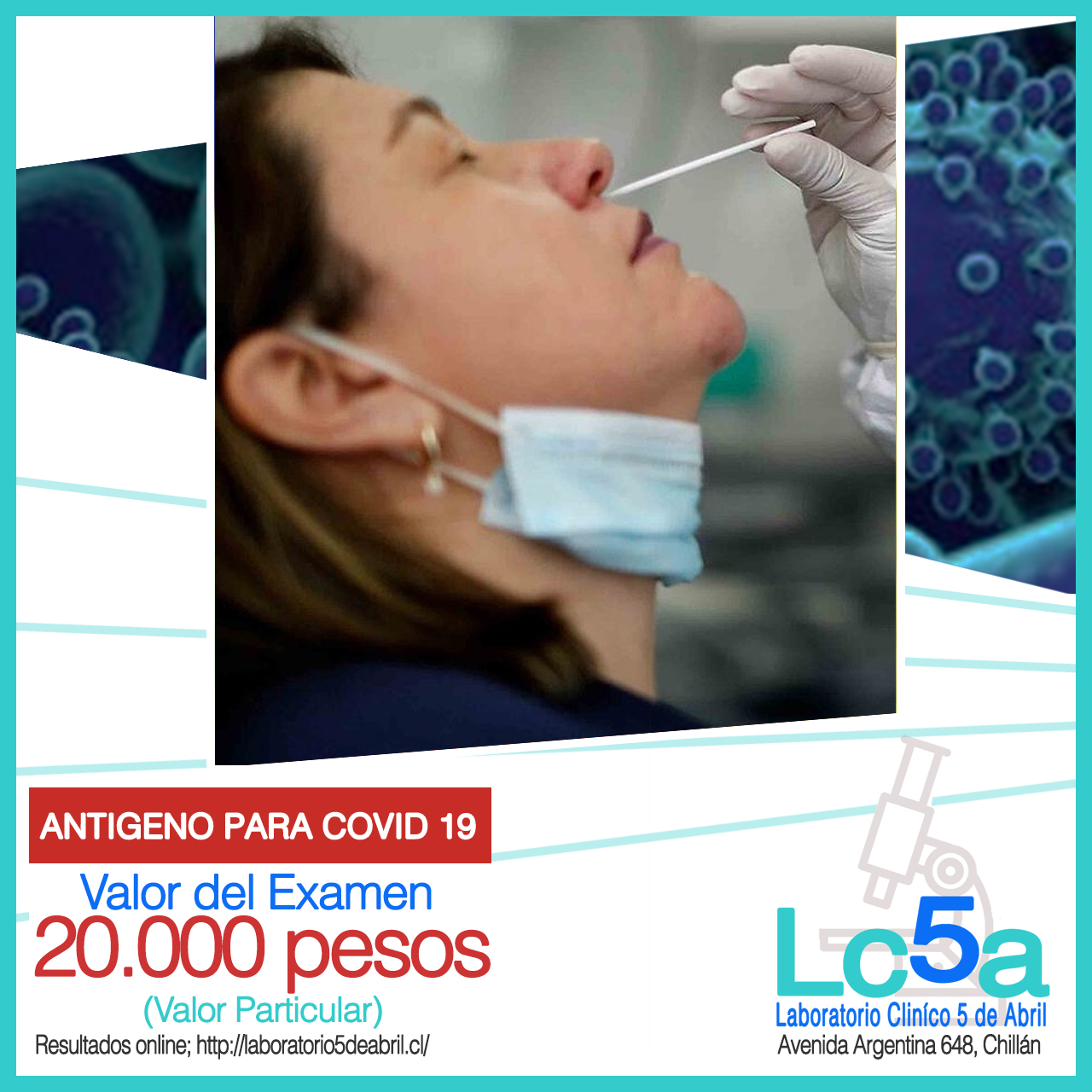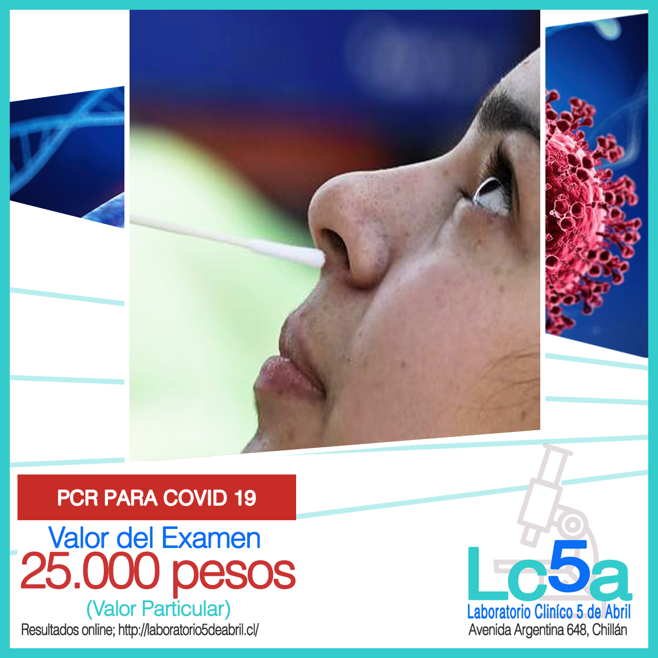 No requiere orden médica Valor del examen 20.000 pesos (solo valor particular) Centros de atención: Casa Matriz: Centro Medico Cordillera; Av. Argentina 648, Chillán, Toma de Muestra Covid-19: de 8:30 a 13:00 horas Mesón de Atención de 8:30 a 18:00 horas de lunes a viernes Y sábados de 8:30 a 12:30 Toma de Muestra: Centro Medico 5 de Abril; Calle 5 de abril 570, Chillán. Horario Toma de Muestra Covid-19: de 8:30 a 13:00 horas Mesón de Atención de 8:30 a 18:00 horas de lunes a viernes Puede ver los resultados online, ingresando a nuestro sitio web; http://laboratorio5deabril.cl/